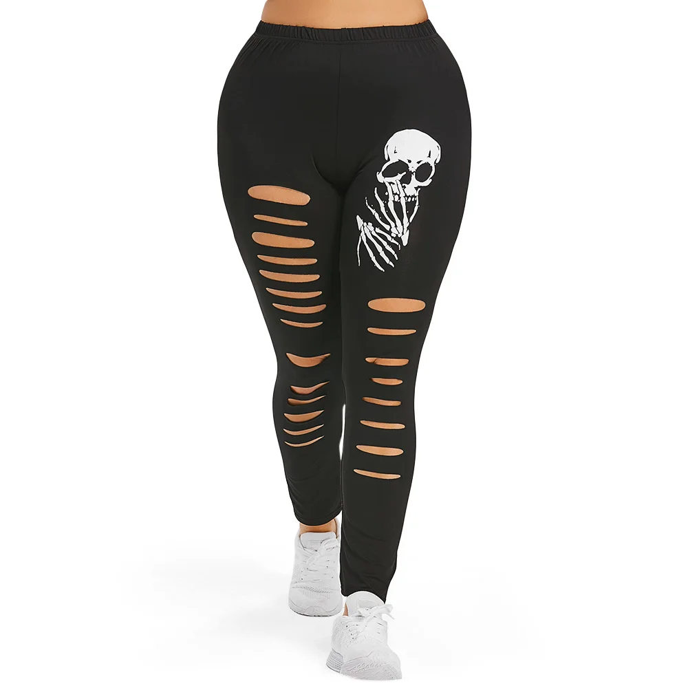Buy New Plus Size Pants Women Elastic High Waist Sport Trousers Shredding Ripped Skulls Print Leggings Female Causal Skinny Leggings Cheap Online
